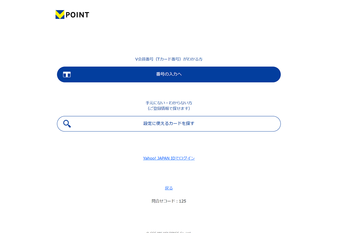 V会員番号がわかる方は「番号の入力へ」、わからない方は「設定に使えるカードを探す」よりご登録できます。なお、Yahoo! JAPAN IDにV会員番号を連携されている方は「Yahoo! JAPAN IDでログイン」からもご登録いただけます。