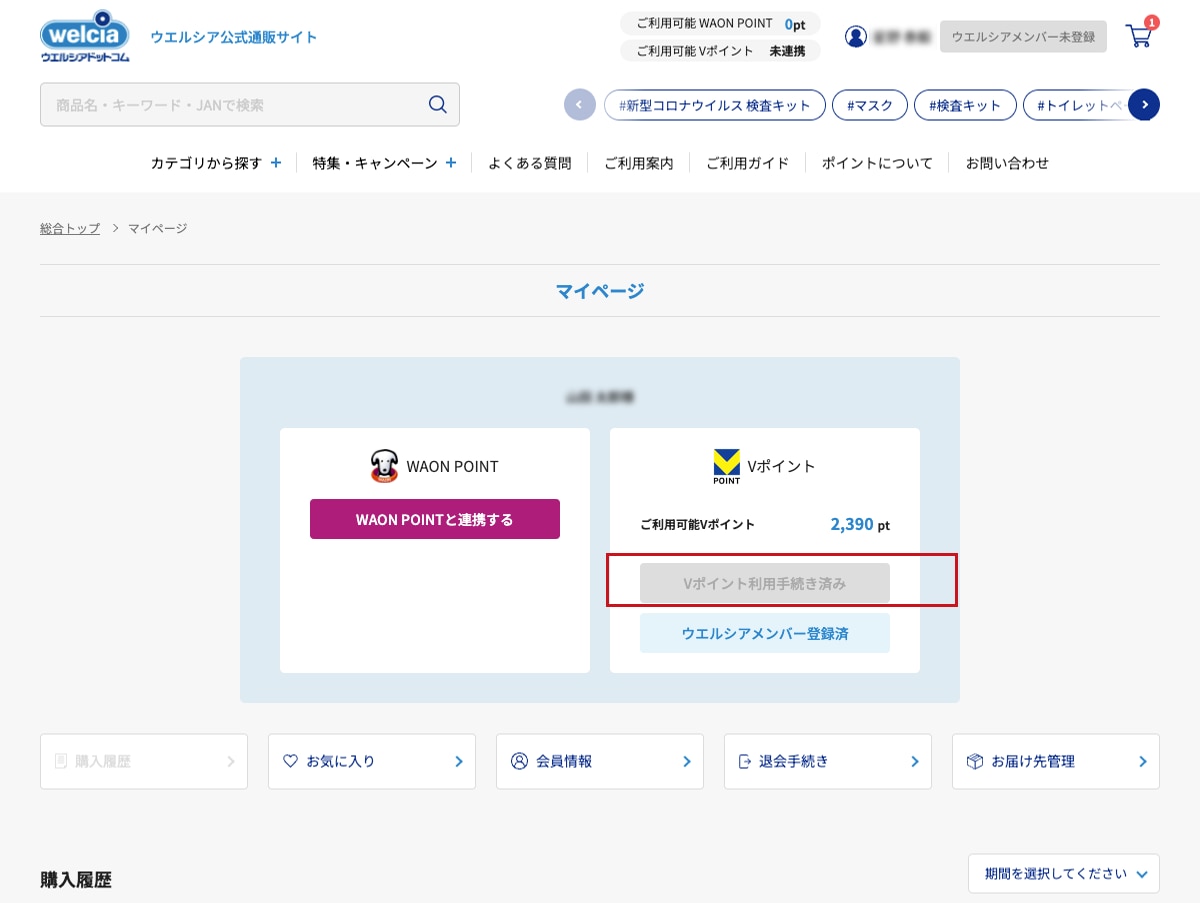 ウエルシアドットコムの画面に戻り、『Vポイント利用手続き済み』と表示されたら手続き完了です。