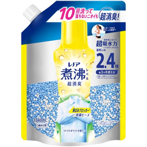 ●しみついた臭いも煮沸レベル消臭(※1)●繊維の奥に浸透●発泡ビーズ(※2)●洗剤・柔軟剤では落ちないニオイに(※3)●衣類が消臭フィルターに●洗濯槽の防カビ(※4)も●エリそでの黄ばみブロック(※5)まで●12週間消臭力が続く(※6)●柔軟剤と比べて超吸水力(※7)※1…洗濯後・部屋干しにて検証。※2…製造過程で含んだ空気が水に溶ける際にミクロの泡となって発生することを指します。※3…当社洗剤・当社柔軟剤比。※4…既に付着していたカビや汚れを取り除くわけではありません。※5…皮脂を再現した成分と綿の生地の模擬実験にて検証。※6…保管状態で。※7…当社柔軟剤比。複数回洗濯後。