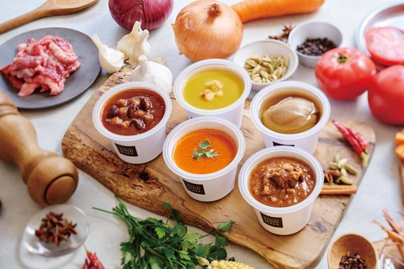 海老の濃厚ビスクスープ×2・国産丸ごと玉ねぎのスープ・北海道産コーンポタージュ・豆と香味野菜のトマトチャウダー・牛すじ肉と野菜を煮込んだカレー各195g
