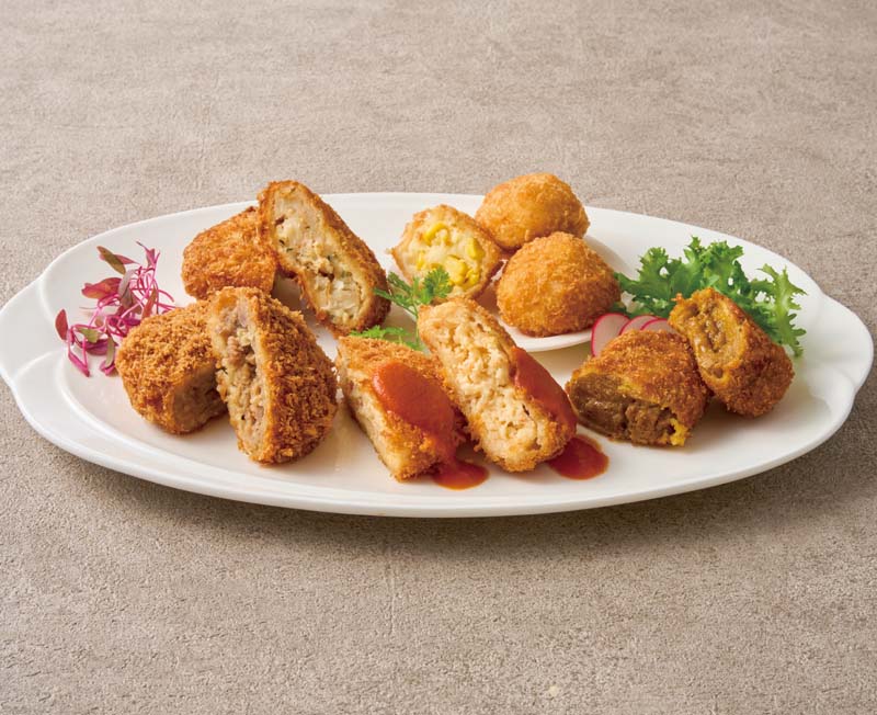北海道産とうもろこしのプチクリームコロッケ180g(6個入)、トマトソースで味わう蟹クリームコロッケ186g(2個入)、海老と帆立のカツ140g(2個入)、ジューシーミンチカツ150g(2個入)、スパイス香るカレーコロッケ180g(3個入)