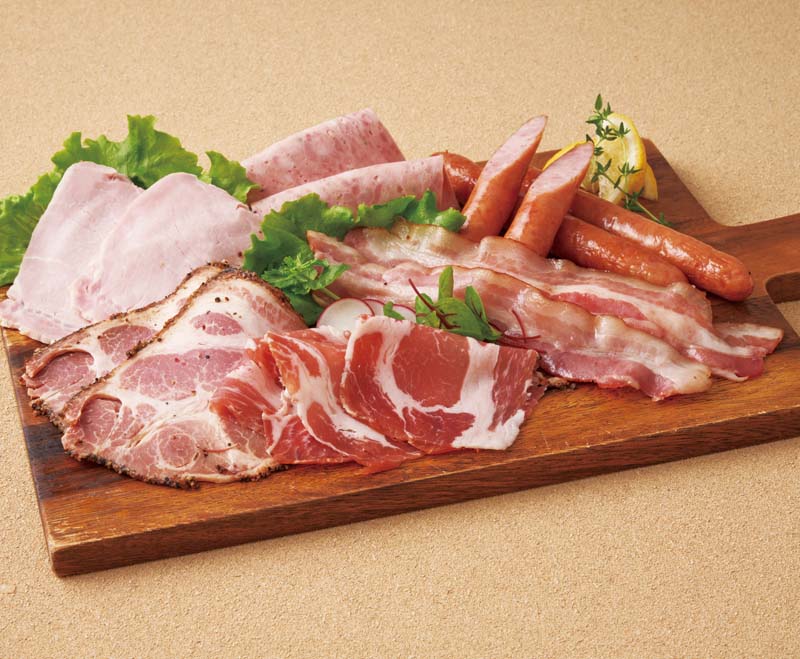 熟成乾塩ベーコン80g、生ハム(肩ロース)40g、カントリーロースト・ペッパーシンケン各72g、チーズリヨナー36g、あらびきポークウインナー120g
