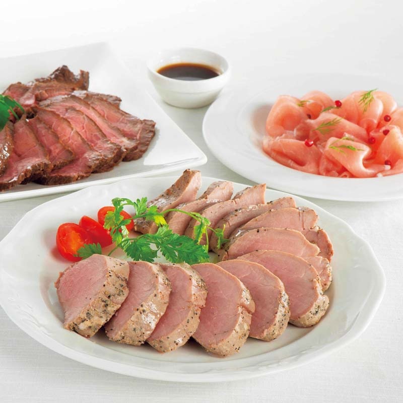 豚ひれ肉のやわらかローストポーク360g、直火焼ローストビーフ(グレービーソース付)160g、ロース生ハム67g