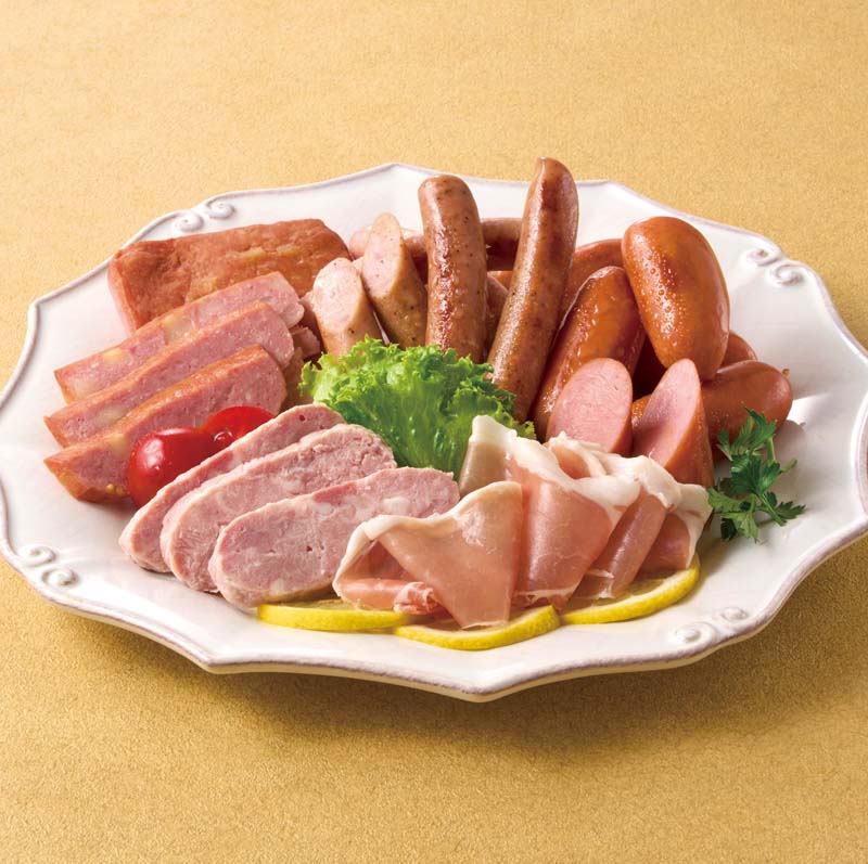 ワインももハム130g、ワイン生ハムロース35g、じゃがバターソー・オニオンフランク各180g、ソフトサラミ・あらびきウインナー(帆立エキス入り)各75g