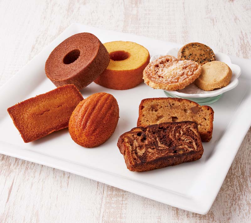 フィナンシェ、はちみつマドレーヌ、マーブルケーク、マロンケーク、パルミエ・バームクーヘン(プレーン・ショコラ)×各2、クッキー(黒胡麻と黒糖・バニラ)×各5