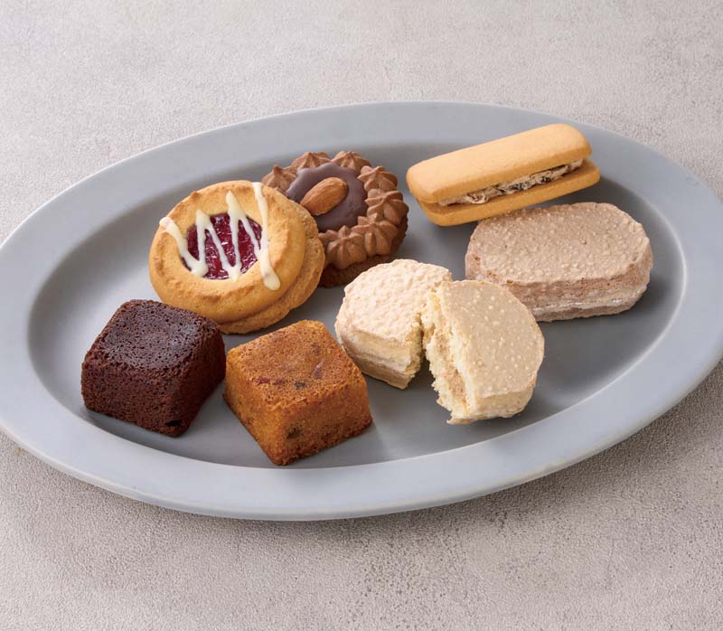 レーズンサンド×4、ダックワーズ(ヘーゼルナッツ・コーヒー)×各2、ドライケーキ(ベリーレモン・チョコアーモンド)×各2、チョコレートケーキ・フルーツケーキ×各2