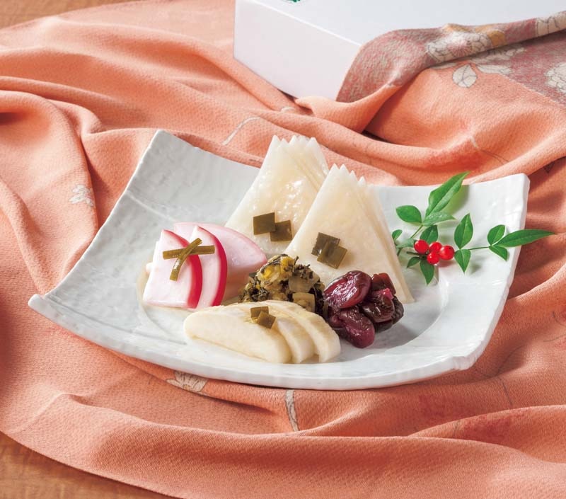 千枚漬70g、赤かぶら切漬62g、こぶ漬白菜132g、壬生菜漬・味すぐき・赤しそ胡瓜各40g