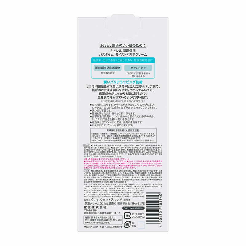 湯あがり乾燥する前に、ぬれた肌に使うクリーム。潤いバリアラッピング。セラミド機能成分*(潤い成分)を含んだ潤いバリア膜が、肌がぬれたまま潤いを密封。タオルでふいても、保湿成分がしっかりと肌に残るので、全身膜で守られているような潤い肌に。*ヘキサデシロキシPGヒドロキシエチルヘキサデカナミド ●消炎剤配合(有効成分)配合。肌荒れを防ぐ。 ●翌朝も潤ったまま、健やかな肌に保ちます。(医薬部外品)