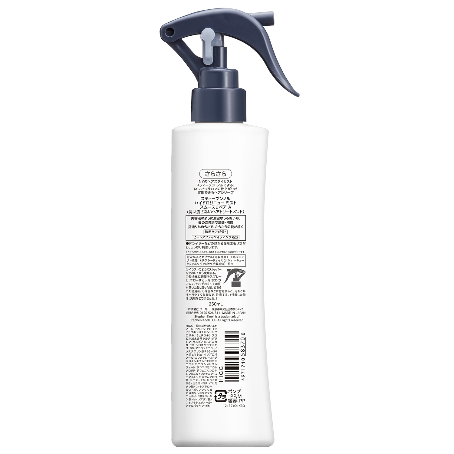 スティーブンノル ハイドロリニューミスト スムースリペア A (洗い流さないヘアトリートメント) 250mL : 美容液のように濃密なうるおいが、髪の深部まで浸透・補修。指通りなめらかで、さらさらの髪が続く。酸熱ケア成分 (ヘアアイロン・ドライヤーの熱を活かしてなめらかな髪に仕上げます) 。ヒートアクティベイティング処方。ドライヤーなどの熱から髪をまもりながら、しっかり補修します。W高浸透カプセル (毛髪補修) 、熱プロテクト処方、チアシードオイル (ツヤ) 、キューティクルリペア成分 (毛髪補修) 配合。
