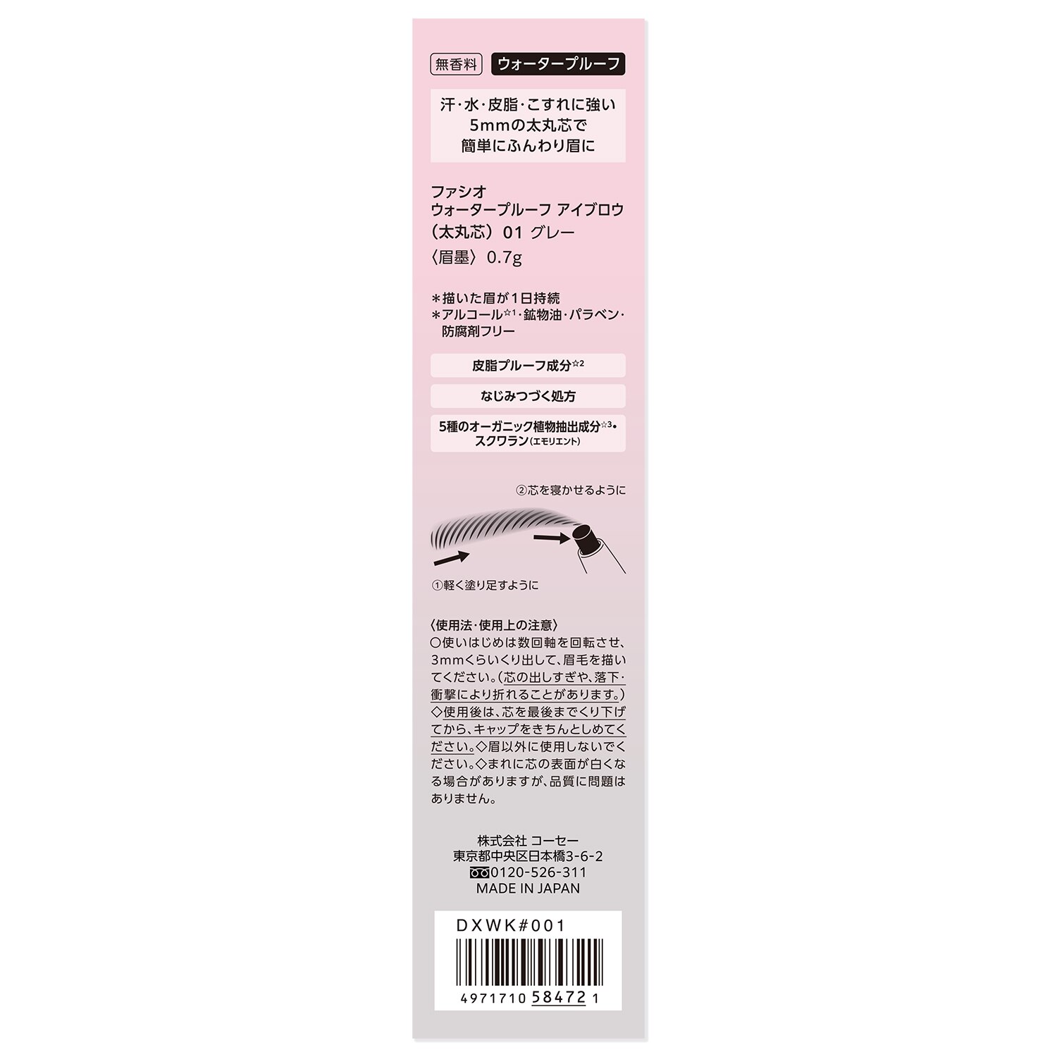ファシオ ウォータープルーフ アイブロウ (太丸芯) 01 グレー (眉墨) 0.7g : 1日耐久 (当社調べ。個人差があります。) ウォータープルーフアイブロウ。簡単ふわ眉。汗・水・皮脂・こすれに強い5mmの太丸芯で簡単にふんわり眉に。無香料。ウォータープルーフ。描いた眉が1日持続。アルコール (エチルアルコール) ・鉱物油・パラベン・防腐剤フリー。皮脂プルーフ成分 (シリカ) 。なじみつづく処方。5種のオーガニック植物抽出成分 (オリーブ果実油・ホホバ種子油・サフラワー油・シア脂・ゴマ種子油) ・スクワラン (エモリエント) 。