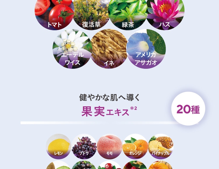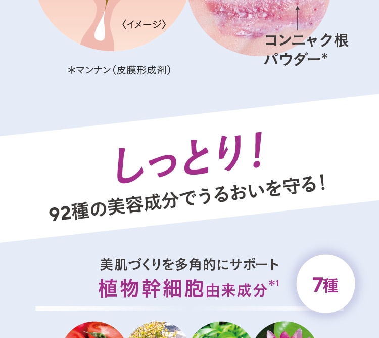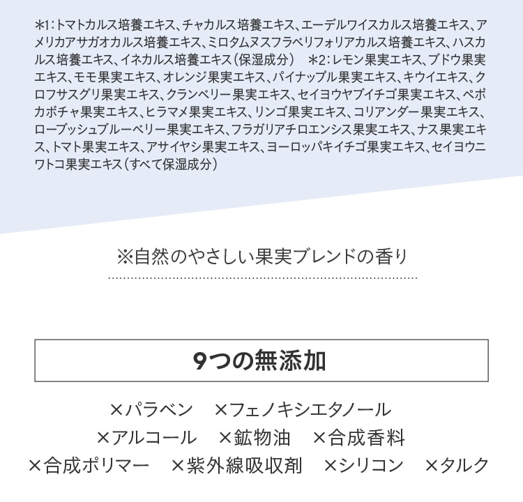 *1:ミロムヌスフラベリフォリアカルス培養エキス、 マスクバラカルス培養エキス、ザクロカルス培養エキス、エーデルワイスカルス培養エキス、ウイキョウカルス培養エキス(保湿成分)