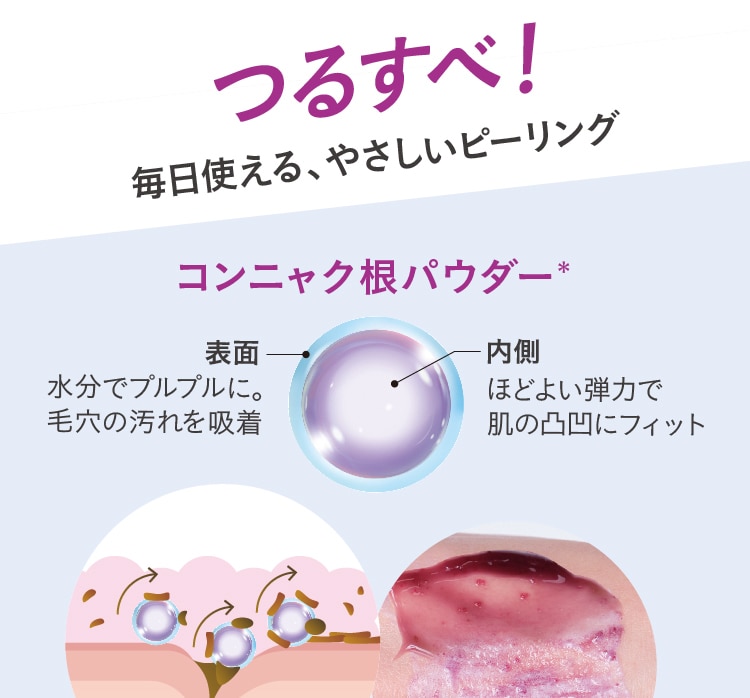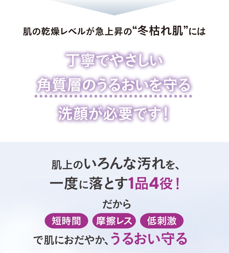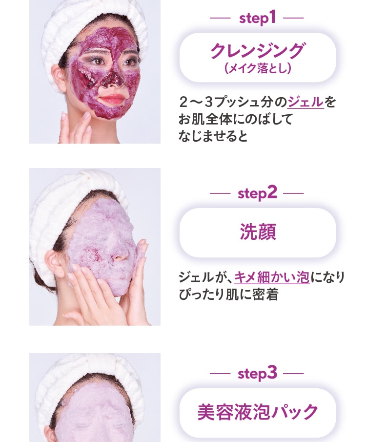 テクスチャーがジェル・泡・クリームと変化することで、メイク汚れ・皮脂汚れ・毛穴汚れ・不要な角質がすっきり落ち、W洗顔不要。同時に「92種類の豊富な美容成分」が肌にうるおいを与え、整えるので洗い上がりはツルンとピカピカなうるおいツヤ肌が現れます。