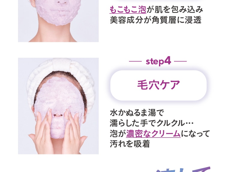 その後、水、又はぬるま湯で、泡がお肌に残らないように充分すすいでください。