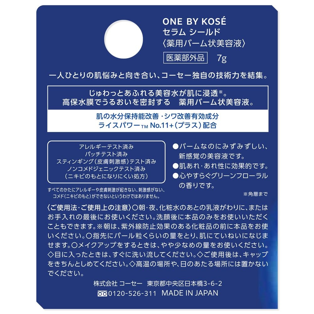 ONE BY KOSE セラム シールド (薬用バーム状美容液) (医薬部外品) 7g : お試し約8日分。うるおい改善+シワ改善。バーム状密封美容液。一人ひとりの肌悩みと向き合い、コーセー独自の技術力を結集。じゅわっとあふれる美容水が肌に浸透 (角層まで) 。高保水膜でうるおいを密封する薬用バーム状美容液。肌の水分保持能改善・シワ改善有効成分 : ライスパワーTM No.11+ (プラス) 配合。バームなのにみずみずしい、新感覚の美容液です。肌あれ・あれ性に効果的です。心やすらぐグリーンフローラルの香りです。アレルギーテスト済み、パッチテスト済み、スティンギング (皮膚刺激感) テスト済み、ノンコメドジェニックテスト済み (ニキビのもとになりにくい処方) : すべてのかたにアレルギーや皮膚刺激が起きない、刺激感がない、コメド (ニキビのもと) ができないというわけではありません。保湿成分 : シロキクラゲエキス、海藻エキス、濃グリセリン配合。エモリエント成分 : アボカドオイル、ホホバオイル、スクワラン配合。浸透 (角層まで) 促進成分。高密封成分。シロキクラゲエキスはシロキクラゲ多糖体、浸透促進成分はシクロヘキサンジカルボン酸ビスエトキシジグリコール、高密封成分はコメヌカロウ・トリ2ーエチルヘキサン酸グリセリルです。