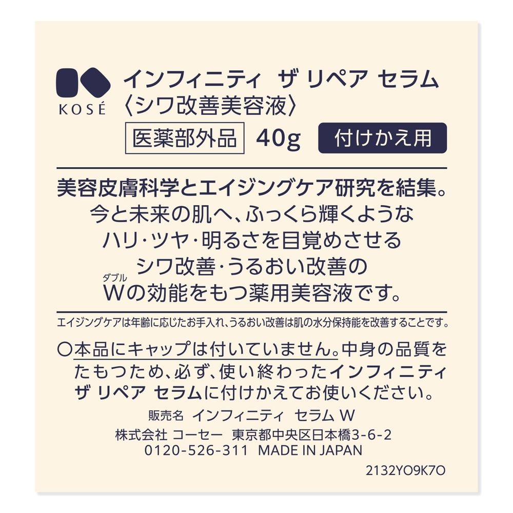 インフィニティ ザ リペア セラム (付けかえ用) (シワ改善美容液) (医薬部外品) 40g : 美容皮膚科学とエイジングケア研究を結集。今と未来の肌へ、ふっくら輝くようなハリ・ツヤ・明るさを目覚めさせるシワ改善・うるおい改善のWの効能をもつ薬用美容液です。エイジングケアは年齢に応じたお手入れ、うるおい改善は肌の水分保持能を改善することです。本品にキャップは付いていません。中身の品質をたもつため、必ず、使い終わったインフィニティ ザ リペア セラムに付けかえてお使いください。