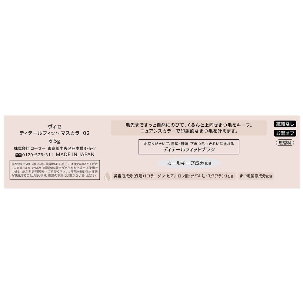 ヴィセ ディテールフィット マスカラ 02 6.5g : 02 ローズブラウン。小回りブラシが1本1本毛を際立てる。ニュアンスカラーマスカラ。ロング&カール。お湯でオフ。繊維なし。無香料。毛先まですっと自然にのびて、くるんと上向きまつ毛をキープ。ニュアンスカラーで印象的なまつ毛を叶えます。小回りがきいて、目尻・目頭・下まつ毛もきれいに塗れるディテールフィットブラシ。カールキープ成分配合。美容液成分 (保湿) (コラーゲン・ヒアルロン酸・ツバキ油・スクワラン) 配合。まつ毛補修成分配合。お湯で簡単に落とせるフィルムタイプです。重ねてもダマになりにくく、きれいにセパレート。にじまず、美しい仕上がりが持続。