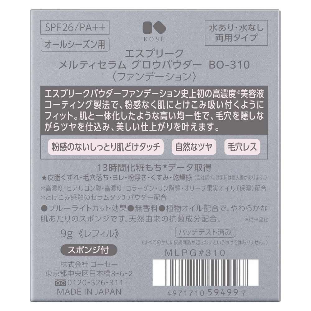 エスプリーク メルティセラム グロウパウダー (レフィル) BO-310 (ファンデーション) 9g : スポンジ付。SPF26/PA++。オールシーズン用。水あり・水なし両用タイプ。ベージュオークル 310。高濃度 (従来品比) 美容液コーティング製法。ツヤどけパウダー。エスプリークパウダーファンデーション史上初の高濃度 (従来品比) 美容液コーティング製法で、粉感なく肌にとけこみ吸い付くようにフィット。肌と一体化したような高い均一性で、毛穴を隠しながらツヤを仕込み、美しい仕上がりを叶えます。粉感のないしっとり肌どけタッチ。自然なツヤ。毛穴レス。13時間化粧もち (皮脂くずれ・毛穴落ち・ヨレ・粉浮き・くすみ・乾燥感 (当社調べ。効果には個人差があります。) ) データ取得。高濃度 (従来品比) ヒアルロン酸・高濃度 (従来品比) コラーゲン・リン脂質・オリーブ果実オイル (保湿) 配合。とけこみ感触のセラムタッチパウダー配合。ブルーライトカット効果。無香料。植物オイル配合で、やわらかな肌あたりのスポンジです。天然由来の抗菌成分配合。パッチテスト済み (すべてのかたに皮膚刺激が起きないというわけではありません。) 。