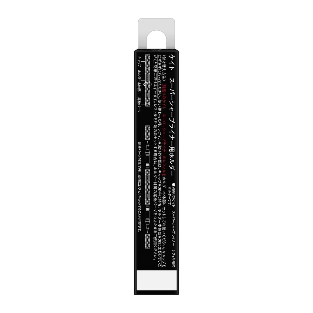 両側にセットできるスーパーシャープライナー専用ホルダー。別売りのケイト スーパーシャープライナーのレフィルをホルダー本体部にセットしてお使いください。キャップをはずさずに行ってください。使い終わった後、レフィルを取り外す際は、キャップを左手に持ち、ホルダー本体部を左にまわしていただくと簡単に取りはずせます。レフィルを片端のみセットする場合は、ホルダー付属の尾栓パーツをつけたままご使用ください。