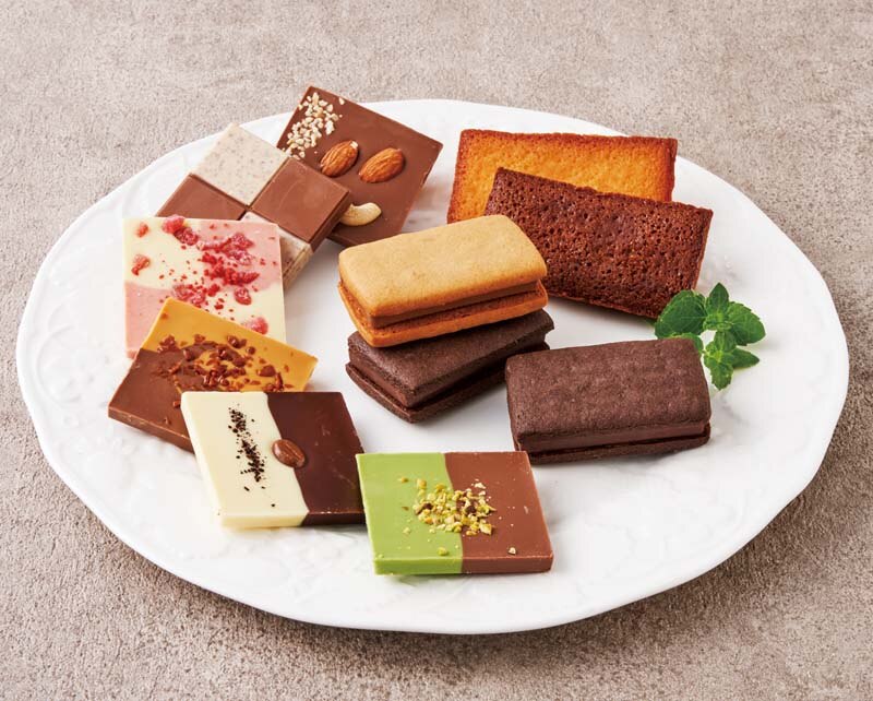 タブレット(ミルク&ナッツ・ティラミス・ピスタチオ・ホワイトストロベリー・クッキーミルク・ミルクキャラメル)、ショコラフィナンシェ(ホワイト×2・ミルク)、ショコラサンド(ビター・キャラメル)
