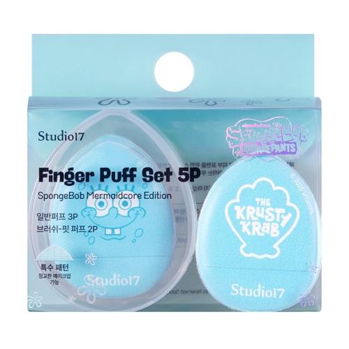 スポンジボブ仕様。韓国初の特許を取得したブラシフィンガーフィットパフ2個、一般フィンガーパフ3個のセット商品。フィンガーサイズなので肌のキワや細かい部分にもフィットし、メイク直しする際にも簡単できれいな修正が可能です。専用のプラスチックケース付属しており、持ち運びにも便利です。