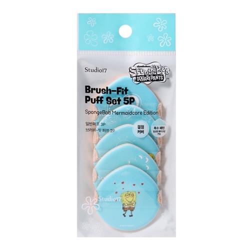 スポンジボブ仕様。韓国初の特許を取得したブラシフィットパフ2個、一般パフ3個のセット商品。肌のキワの形に沿って、薄く均一に密着するフィットしメイク直しする際にも簡単できれいな修正が可能です。
