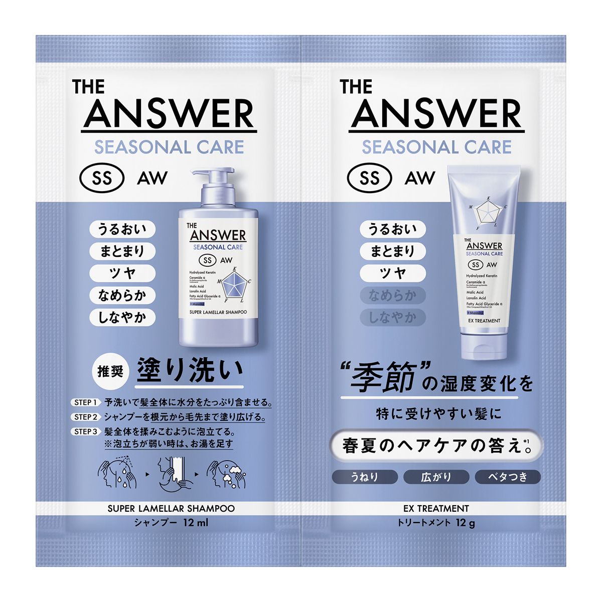 うねり・広がり・ベタつき。季節の湿度変化を特に受けやすい髪に「春夏のヘアケアの答え*」 うるおい、まとまり、ツヤめき、なめらかで、しなやかな髪へ ●高湿度下で髪内部の水の動きを抑えるマンニトール(補修)配合 ●シャンプー内に構築したラメラ層にケア成分を蓄える「ラメラプラットフォーム技術」(シャンプー) ●ジャスミン&マンダリンオレンジの香り *花王内において