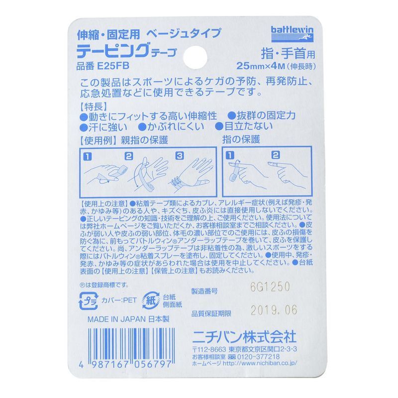 テーピングテープ伸縮の目立たないベージュ色。伸縮性に富み、肩や関節など柔軟性の必要な部位に使用します。非伸縮タイプとの併用でより効果を発揮します。